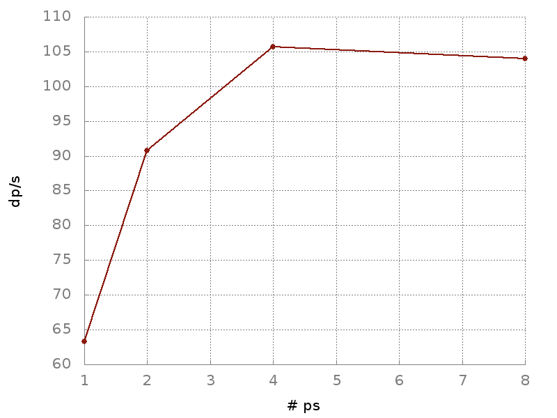 Graph showing the relation between the number of parameter servers and processed data-points per second – we can see that using more parameter servers significantly increases the dp/s