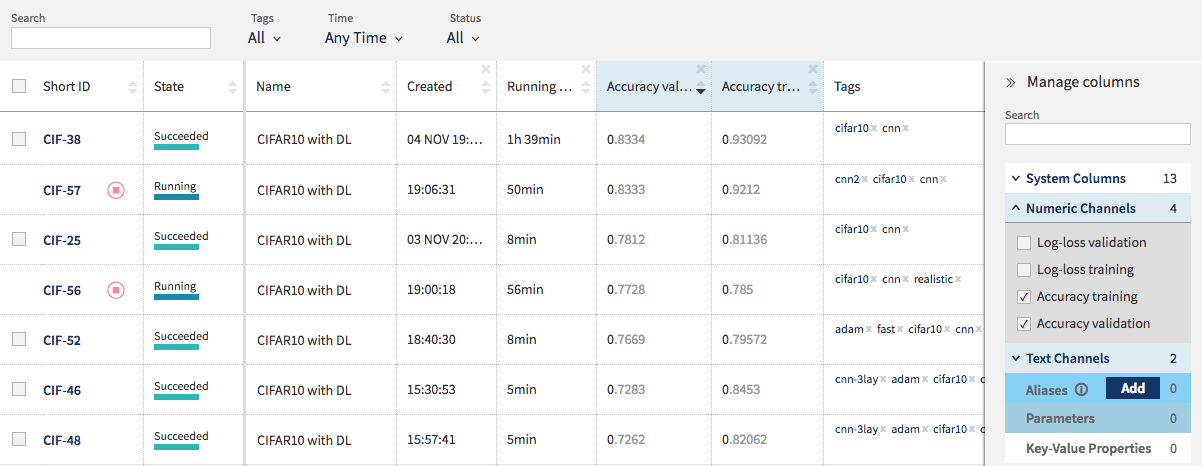 To compare results, click on the project name. You will see the whole list of projects. In Manage columns, tick all accuracy (and possible log-loss) scores. You can order your results using validation accuracy. You get some sort of your own personal Kaggle leaderboard!