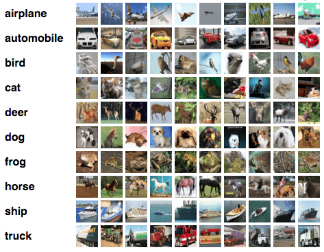 We will work on CIFAR-10, a classic dataset of small color images. It has 60k of 32×32 pixel images, each belonging to one of ten classes. 50k are in the training set (i.e. the one we use to train our neural network) and 10k are in the validation dataset. Have a look at these sample pictures: